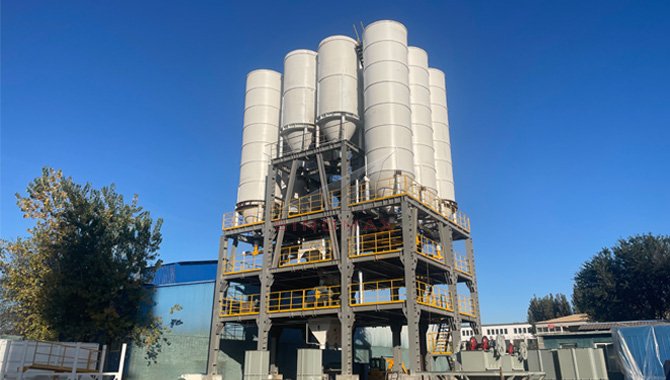 Recently, one tower type line orded by our customer in Tangshan city is under installation. The capacity of this line is 400,000 tons/year and mainly to produce masonry mortar and normal plastering mortar. The silos are installed on the top, saving land occupation.